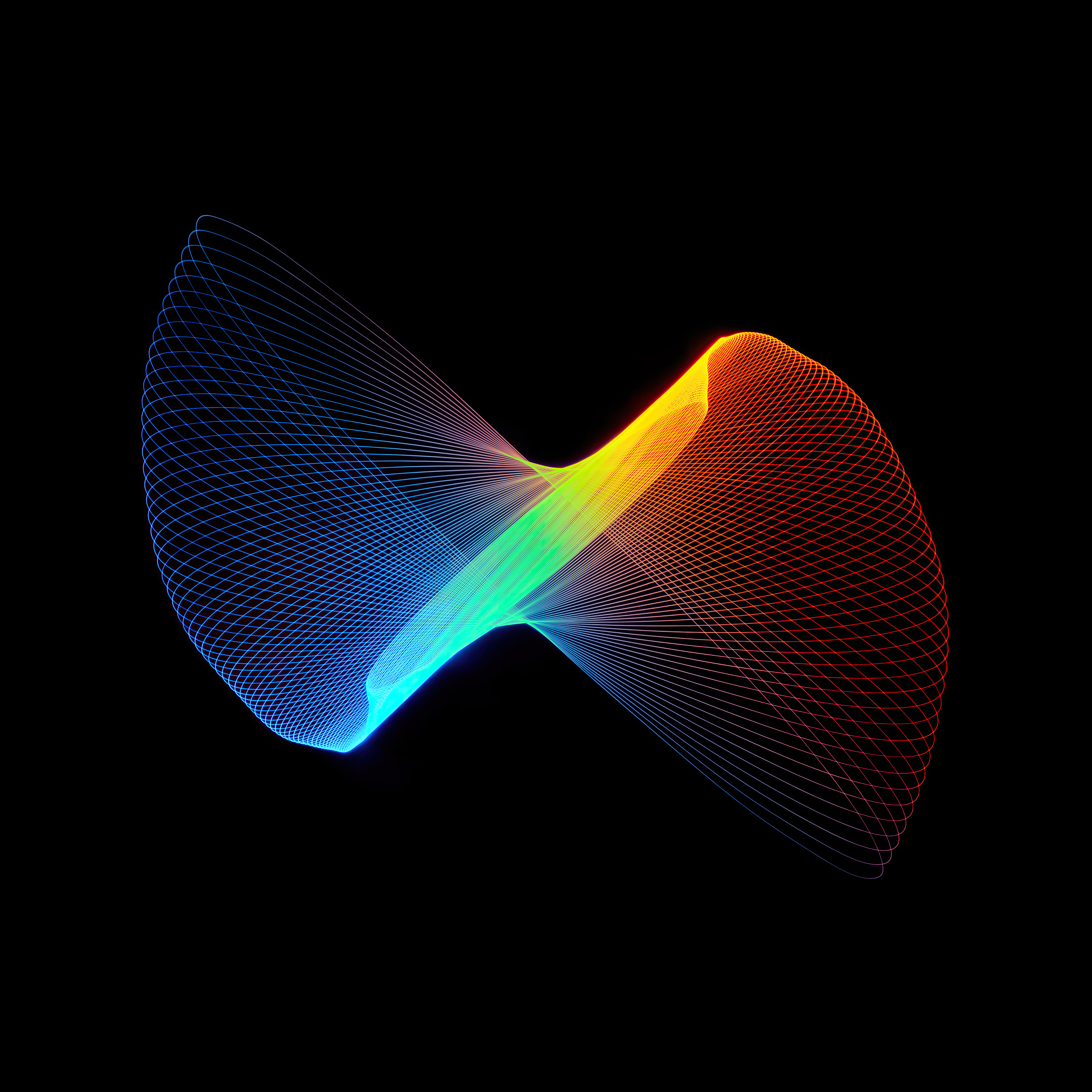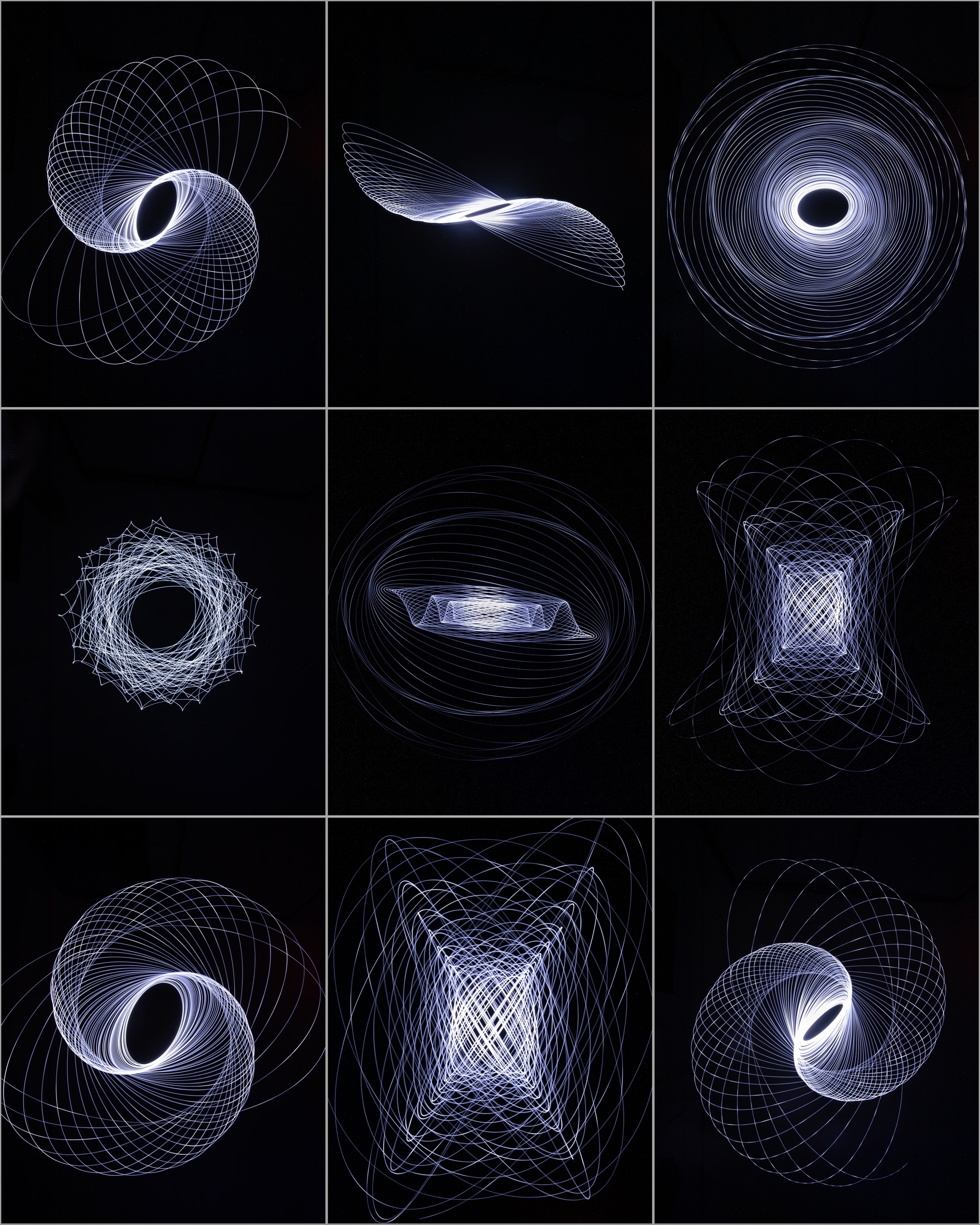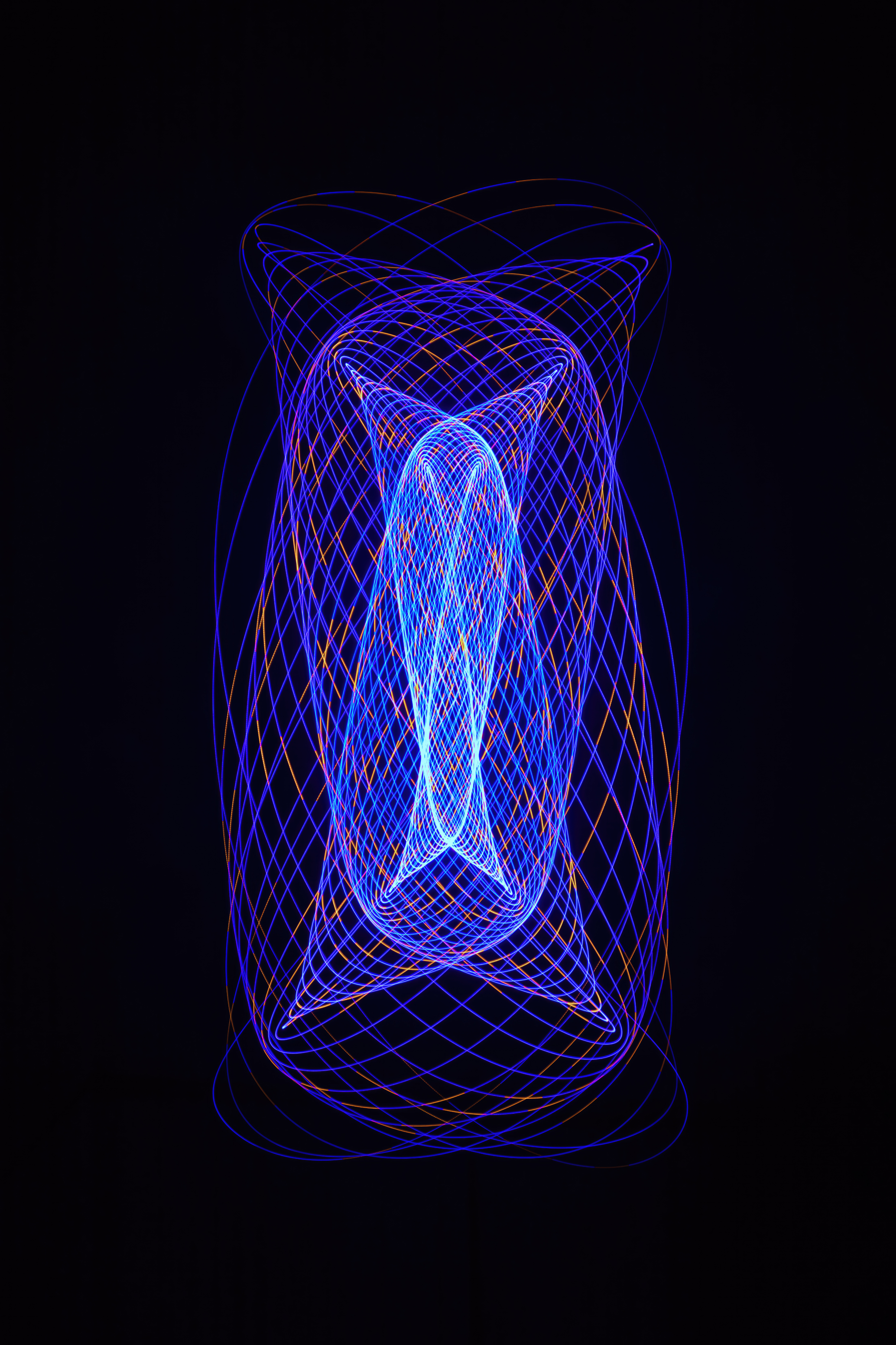 A programmable RGB light attached to the pendulum traces its motion through space. Over time, the camera records this path, revealing geometric structures normally invisible to the human eye.